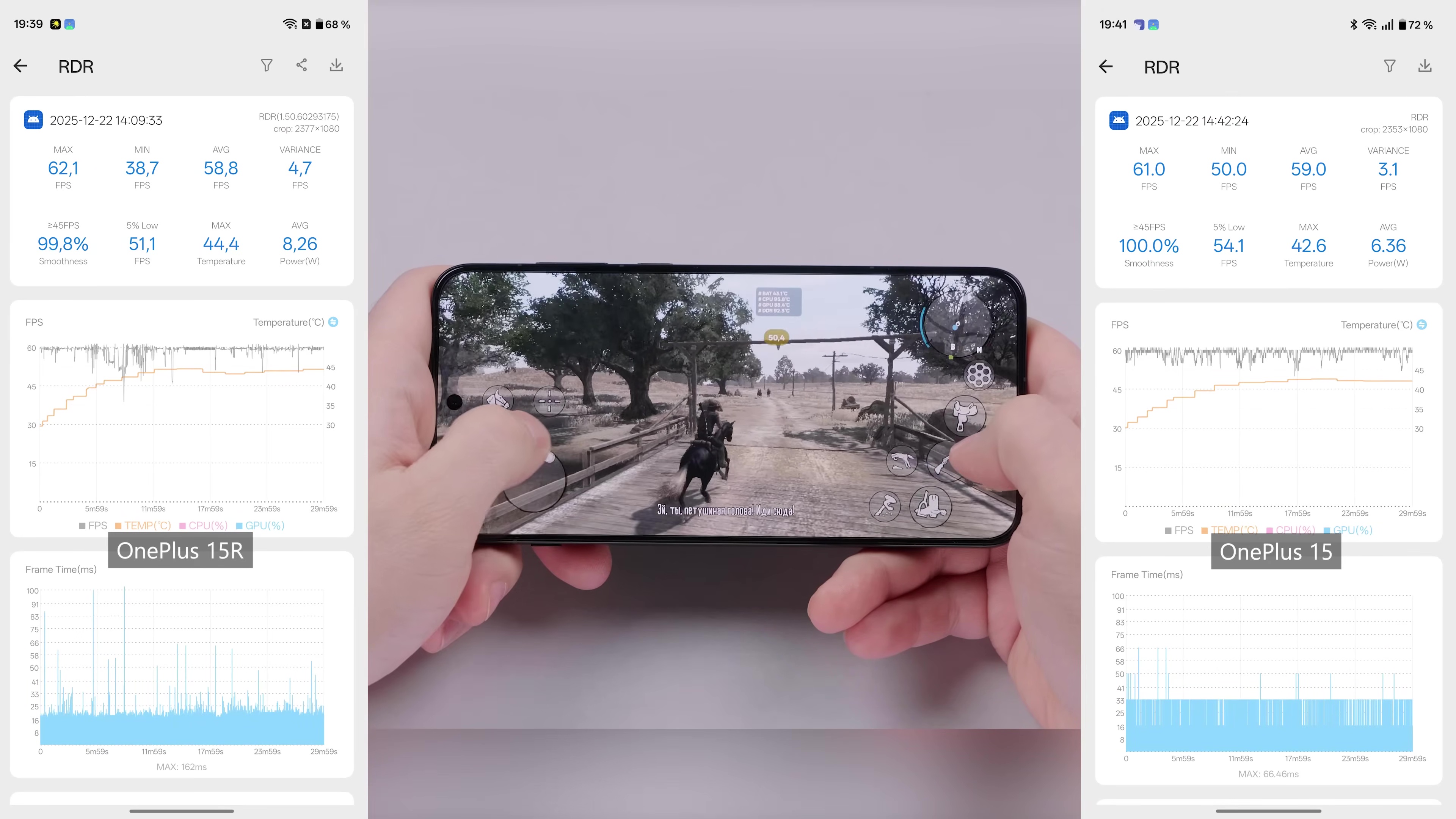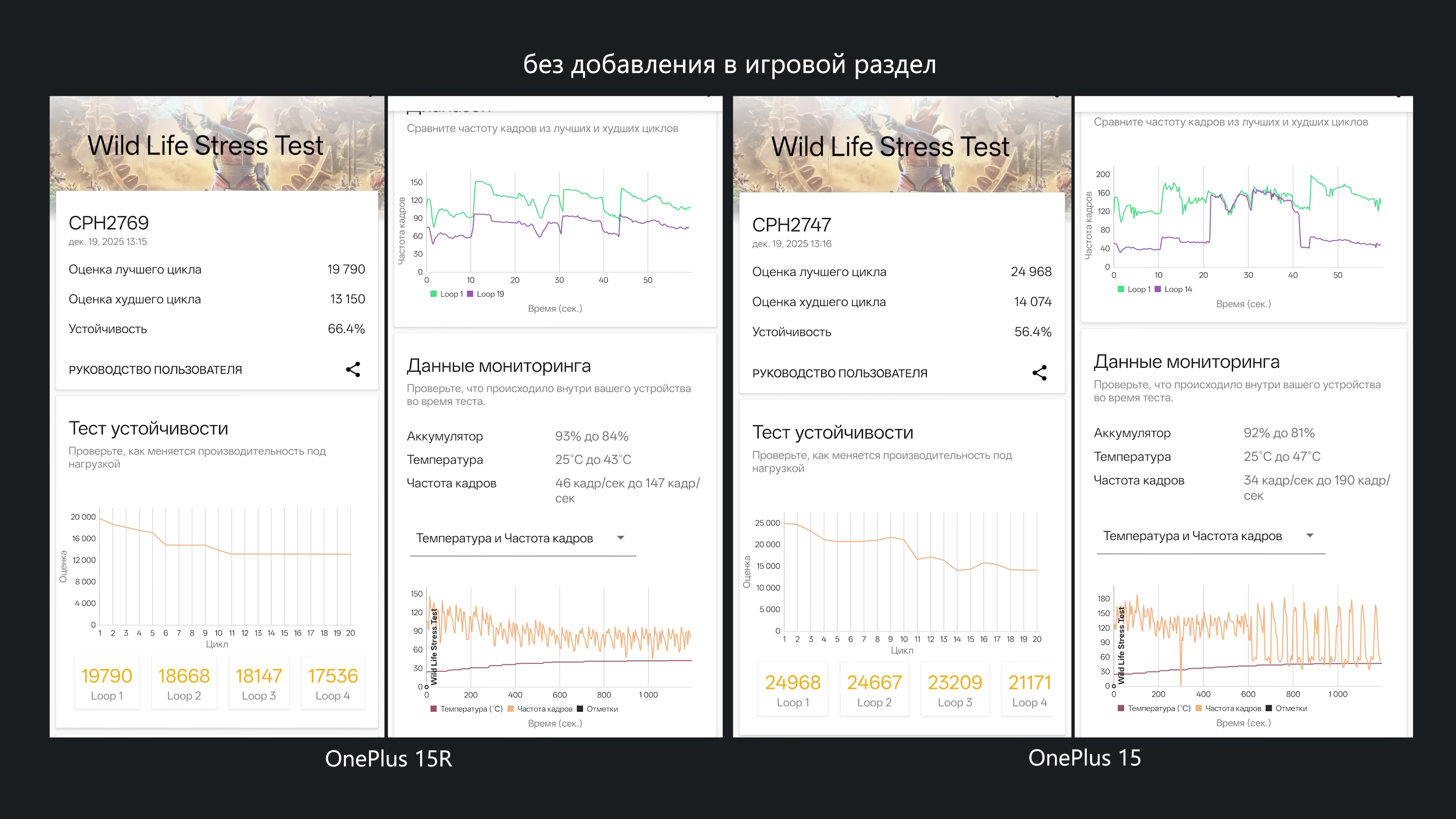 Тесты проводились в двух режимах – без добавления в игровой раздел и с добавлением с активацией улучшалок, чтобы там игровая оптимизация приключилась. Как ни странно, в AnTuTu вне игрового раздела OnePlus 15 делает вещи – более 4 млн попугаев как с куста против 3 млн у 15R. Игровой раздел на 15R никак не влияет, а вот 15 почему-то замедляется – и это похоже на какой-то баг. Вне игрового раздела нагрев у Gen 5 оказался выше.