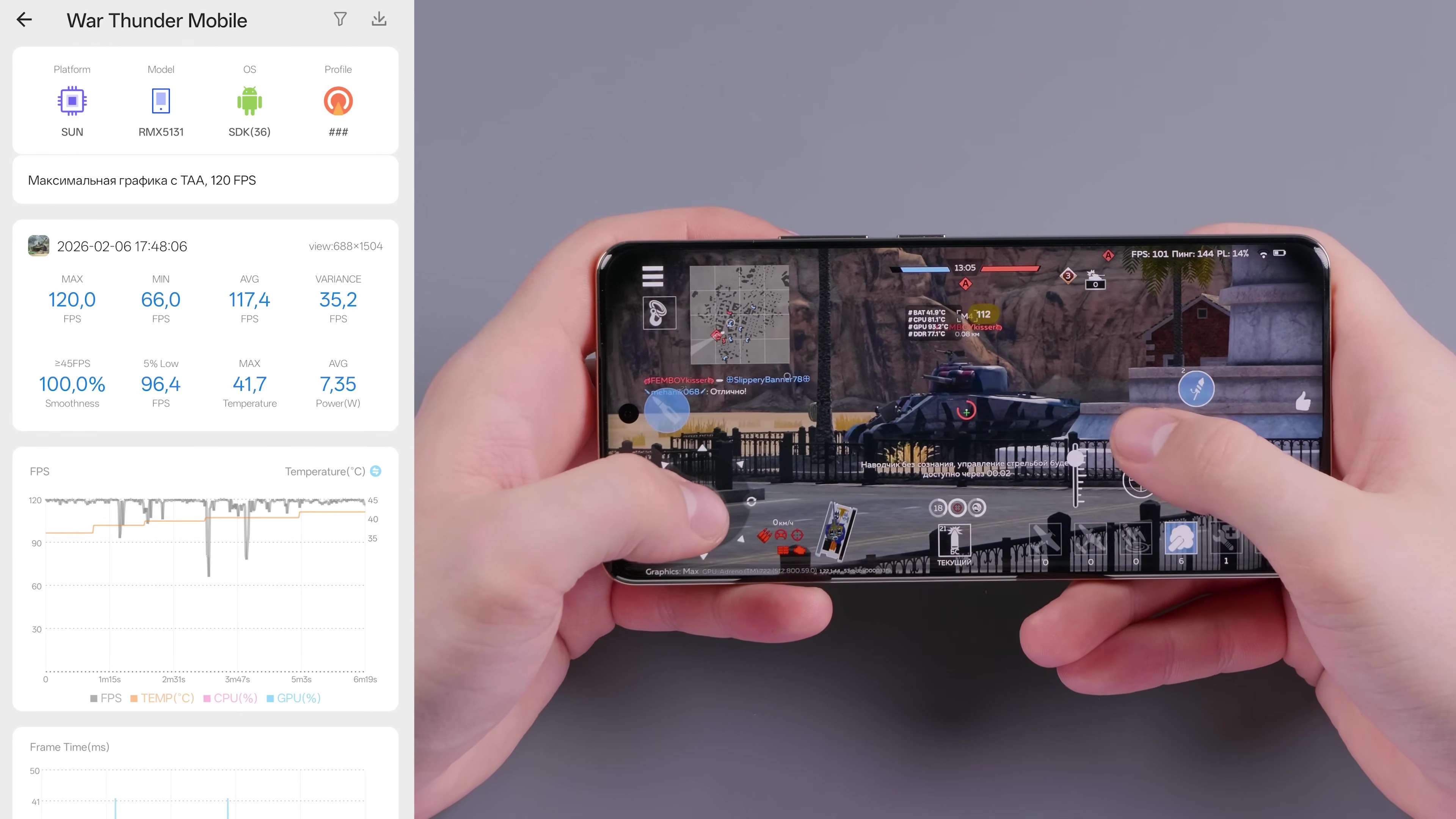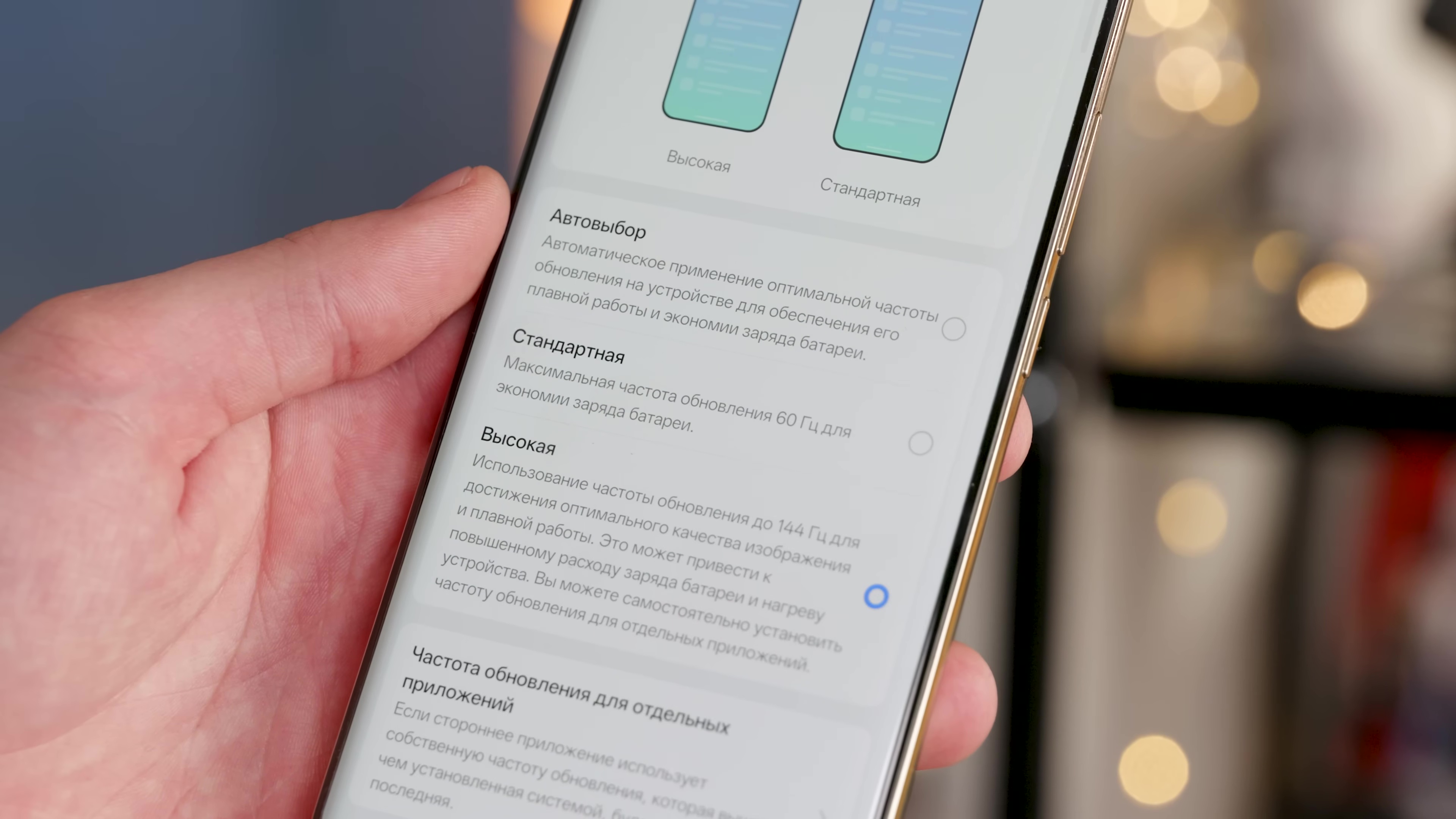 Экран LTPS AMOLED, то есть у него фиксированные частоты от 60 до 144 Гц. В основной массе сценариев будет 120 Гц, а 144 проявляет себя в калькуляторе, очень важно, компасе, гиперважно, и диктофоне, там 144 Гц прям чертовски важно. Ну и в некоторых игрушках у вас тоже будет до 144 фпс.