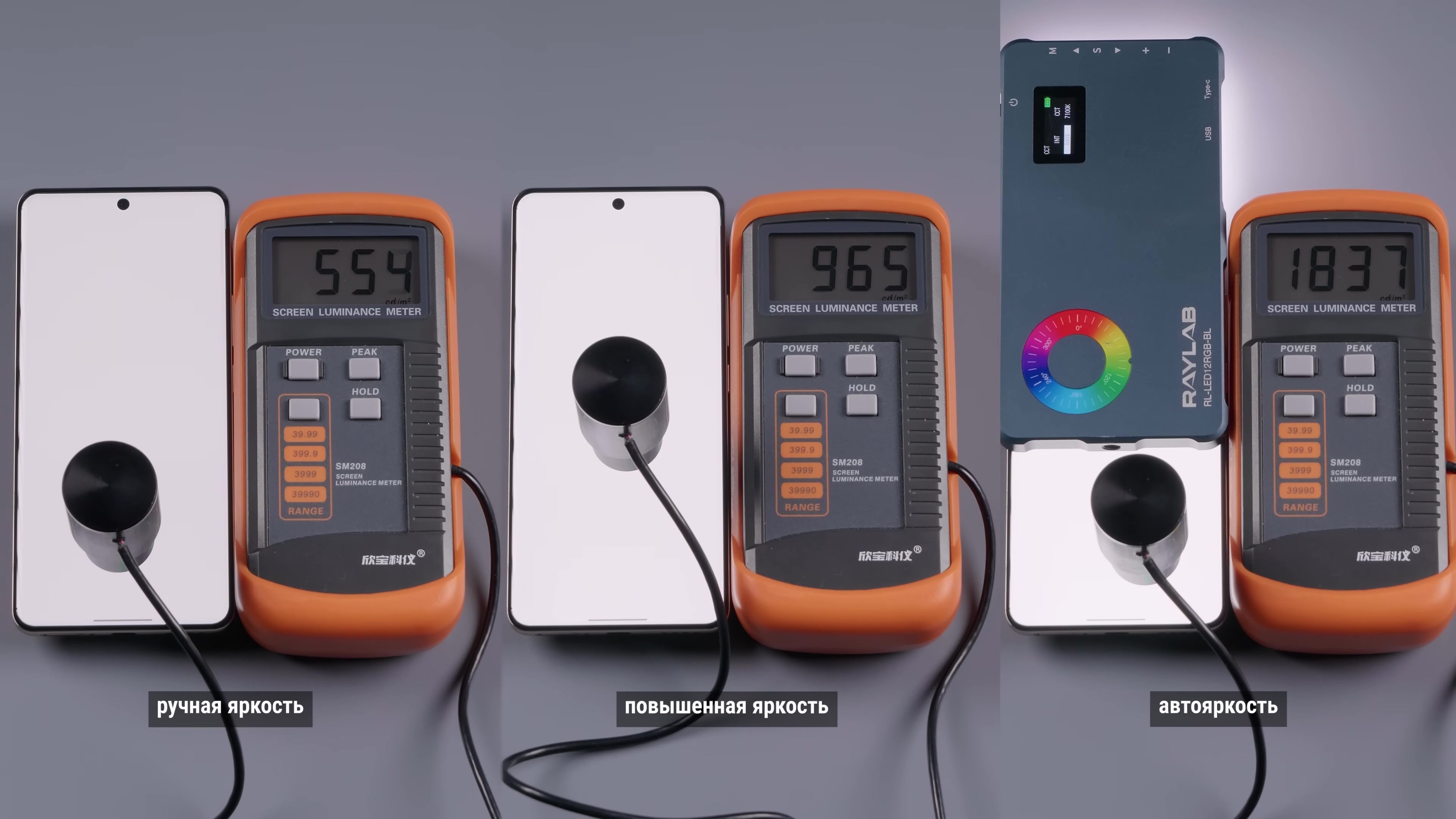 Производитель трясет яркостью и обещает аж 6500 нит на пике, но это HDRовый маркетинг. Впрочем, дисплей все равно яркий. Перед вами три замера: ручная яркость, повышенная яркость и автояркость под источником света.