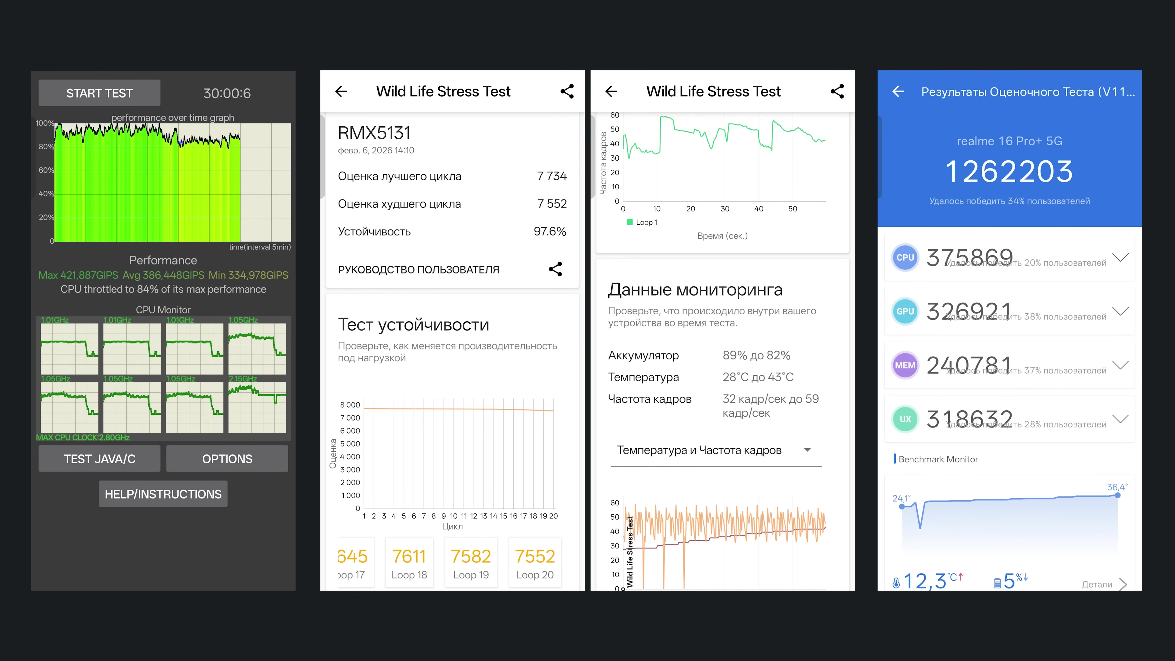 Бенчмарки были добавлены в игровой раздел, где был активирован режим GT. У вычислительных ядер троттлинг проявляется слабо – почти ровная зеленая линия. Также все славно у графических ядер – еще более прямая линия с троттлингом менее 3% и минимальным результатом в 7.5 тысяч баллов. В AnTuTu последней версии товарищ набрал 1.26 млн попугаев.
