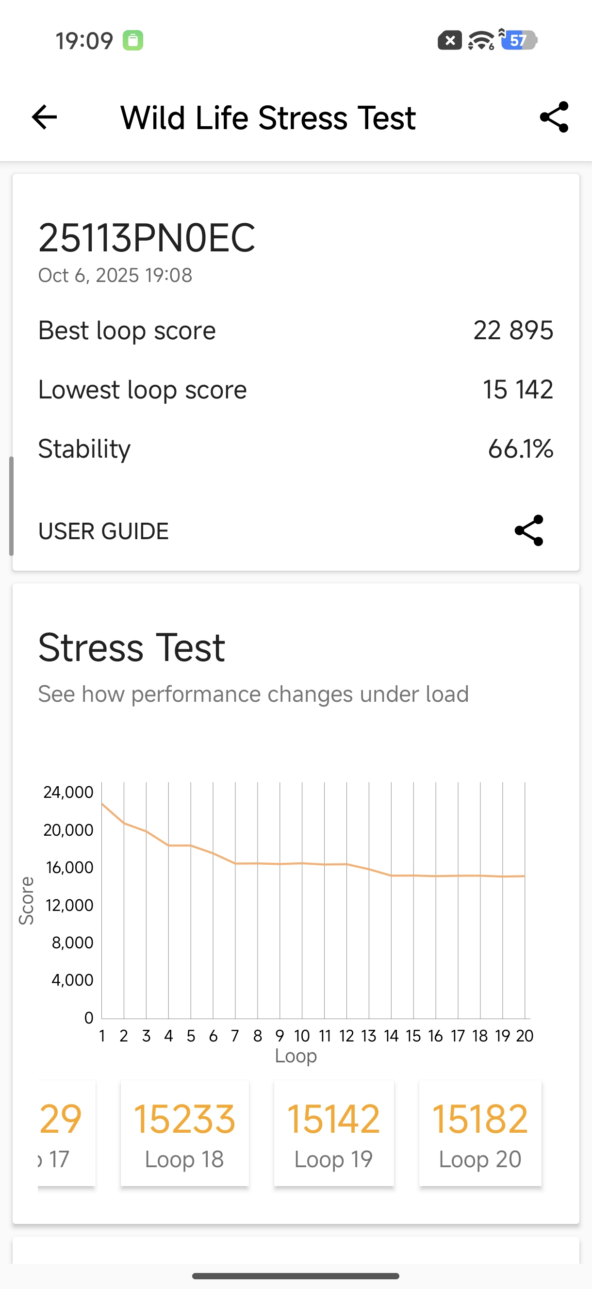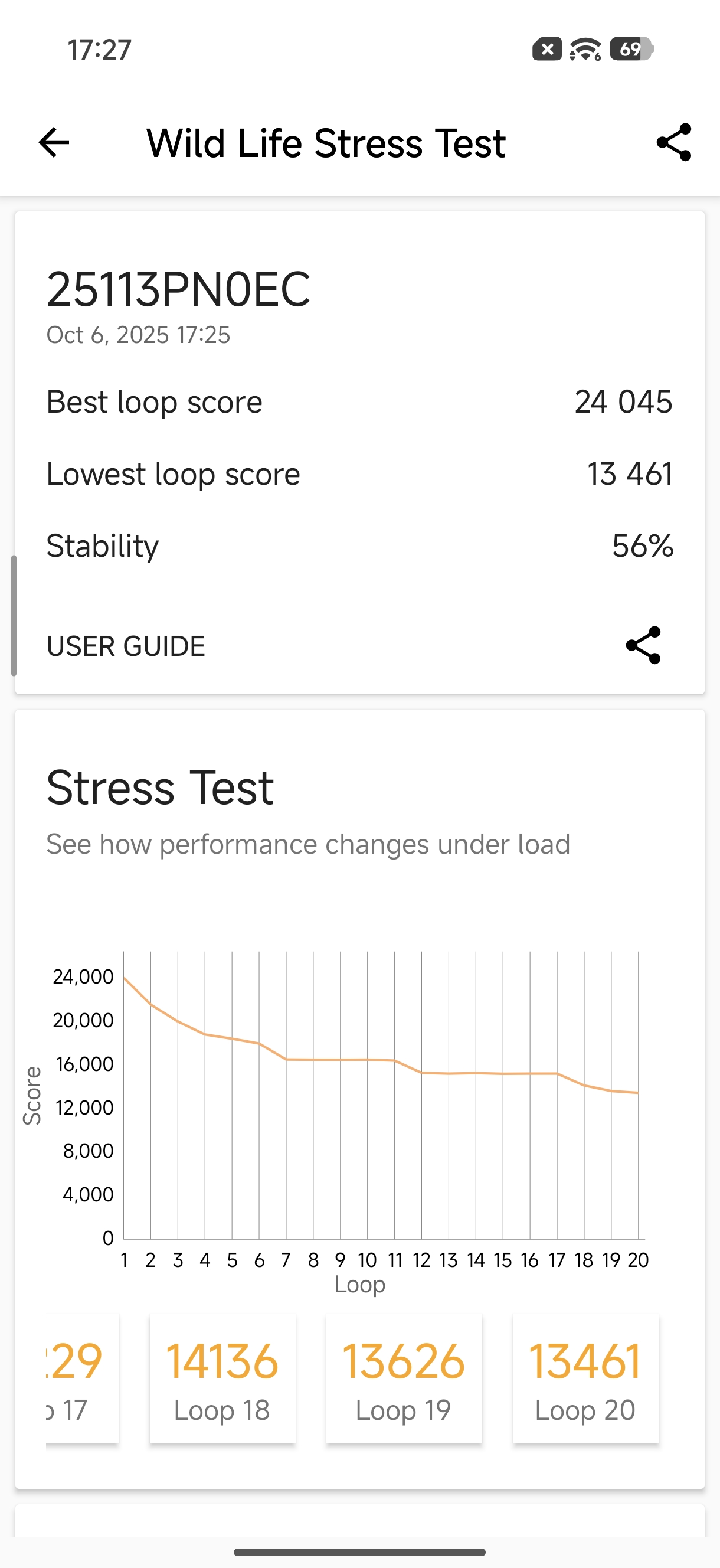 - 3DMark. Тут Xiaomi 17 мощно стартует с отметки в 23-24 тысячи, но к концу теста теряет весь свой потенциал. На выходе мы видим 13-15 тыщ баллов в зависимости от режима. Отмечу, что в производительном режиме стабильность выше на 10%.
