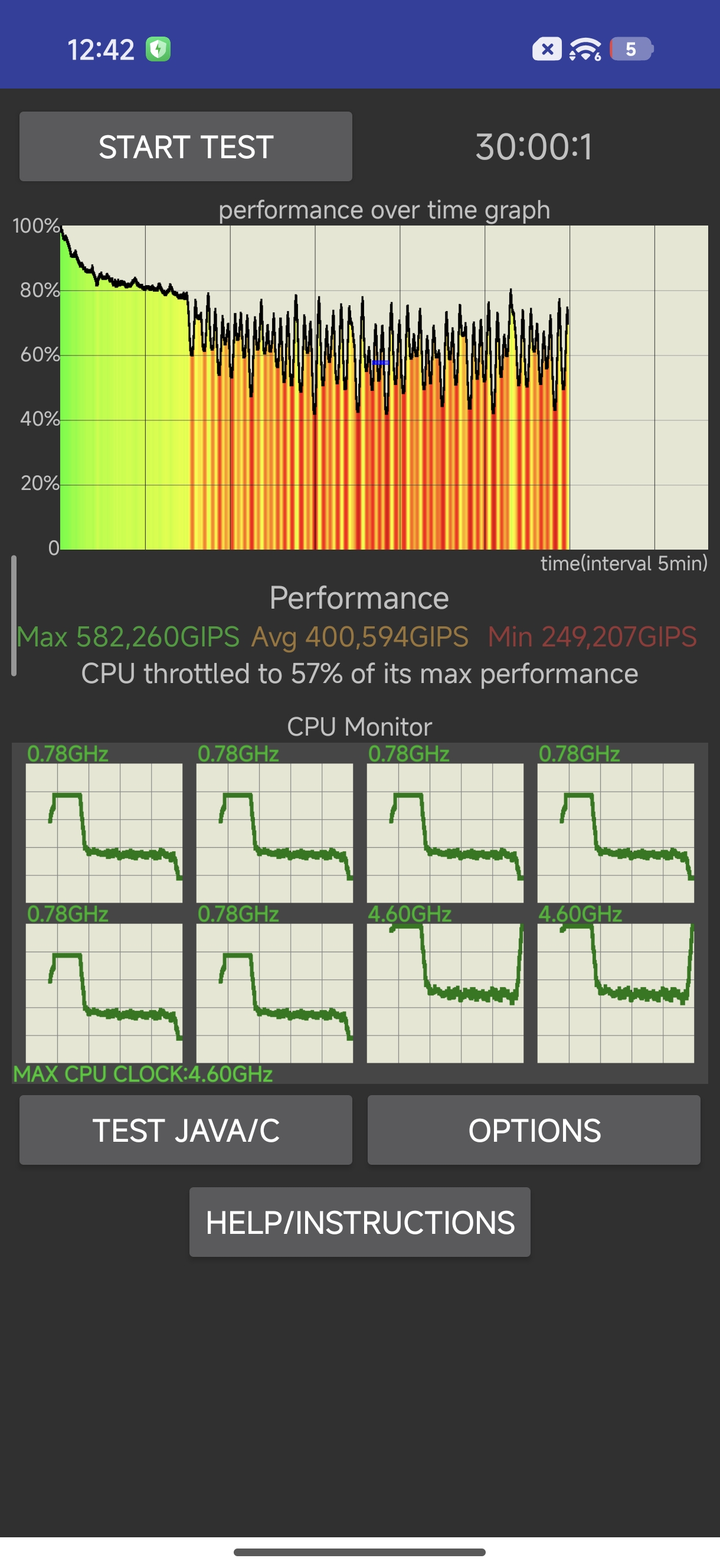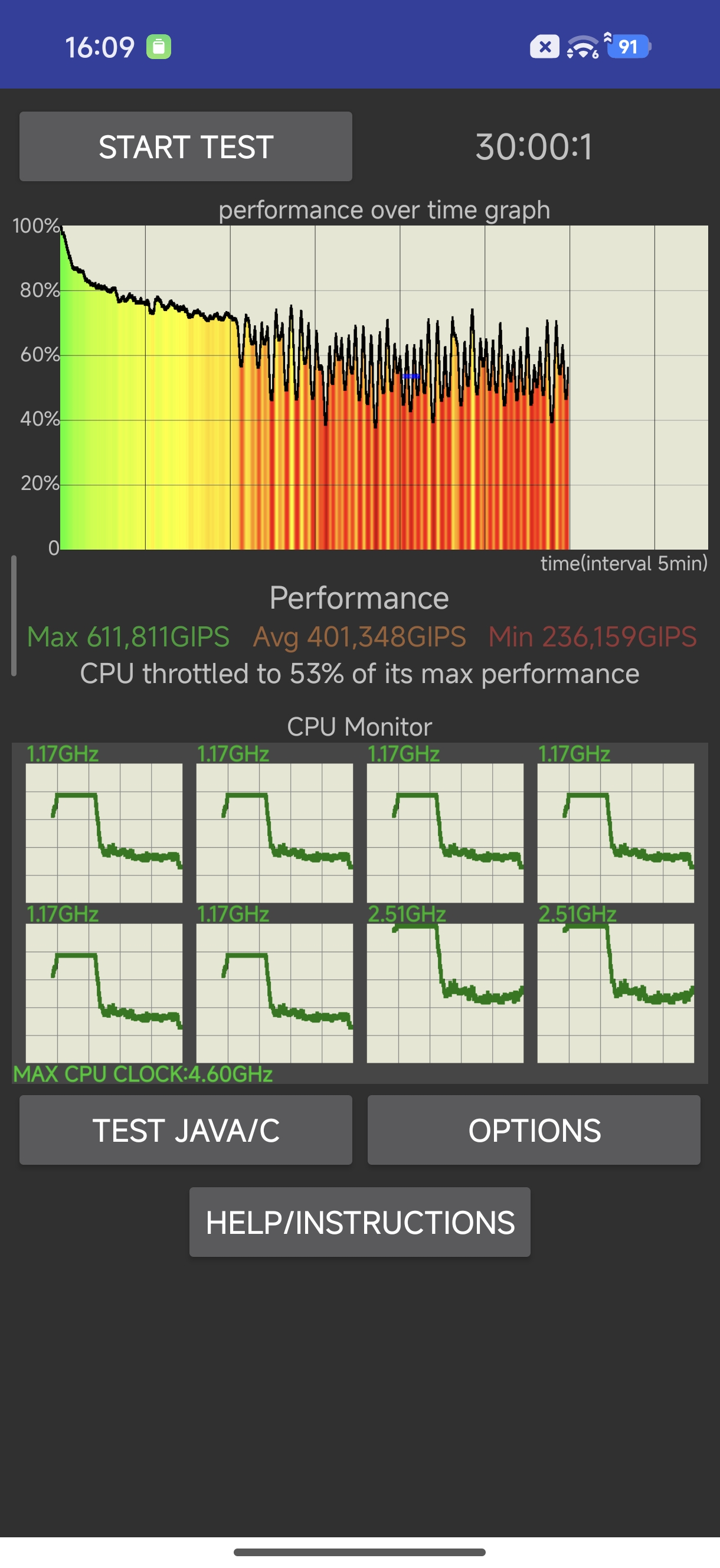 - CPU Throttling test. Среднее значение около 400 GIPS в обоих режимах питания. График не очень прекрасен и очень похож на то, что мы видели у Xiaomi 15. Троттлинг сильный у обоих устройств.