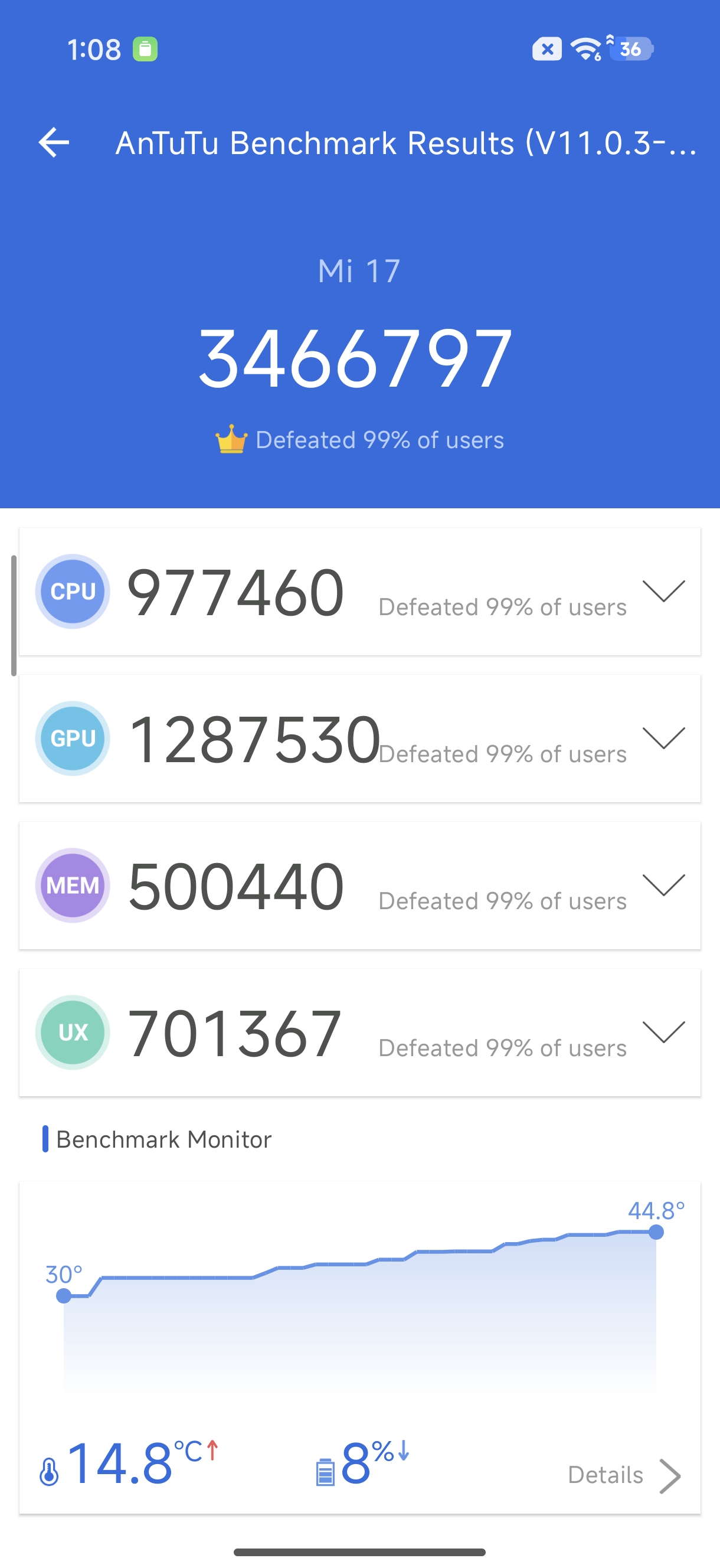 - В AnTuTu Benchmark «семнашка» демонстрирует откровенно больше попугаев, по сравнению с Xiaomi 15, но планку в 3.5М не берет.