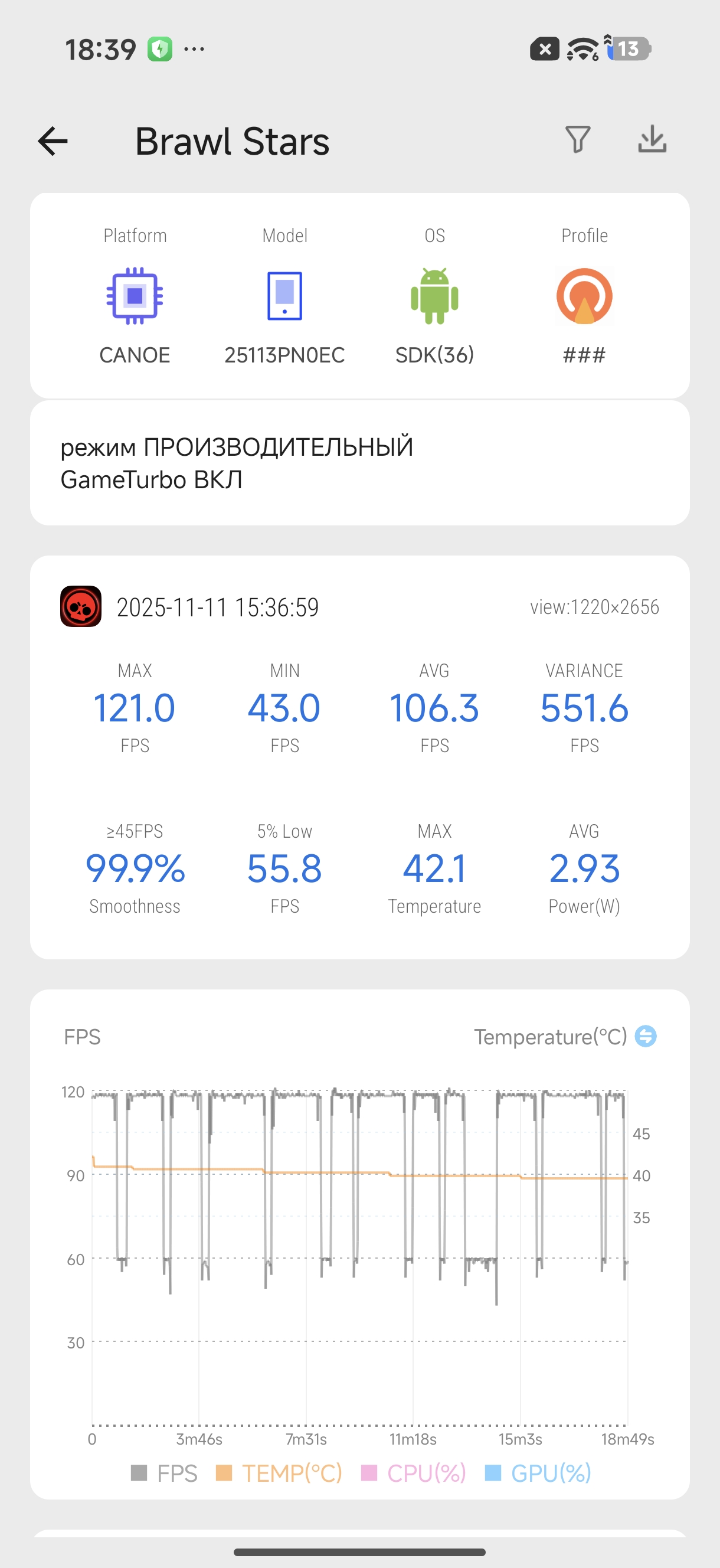- Лакмусовый Brawl Stars идет в 120 кадров в секунду. Сопли на графике – это интерфейс между катками. В общем, малыш меня в игровом плане порадовал. Я лично ждал от него провалов ниже 60. Главное – не стесняйтесь сбрасывать кэш у Battery and Perfomance, если вдруг что пойдет не так с герцовкой. Этож Сяоме.