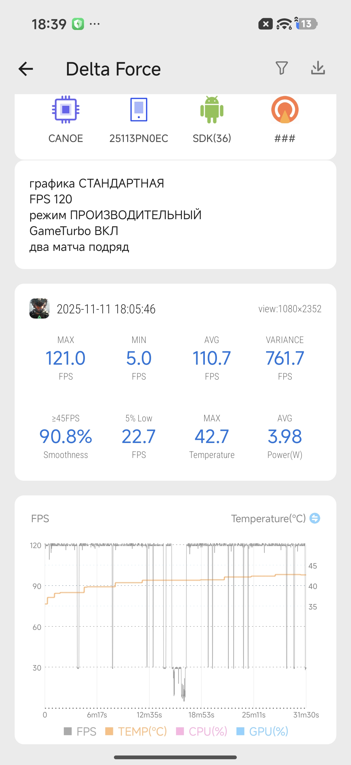 - А вот в Delta Force такого нет. Стандартная графика и 120 FPS в настройках. Прогнал два матча подряд и никакого лока не обнаружил хотя температура добралась до отметки в 42.7 градусов. Играется просто супер. Единственное желание – экран по больше.