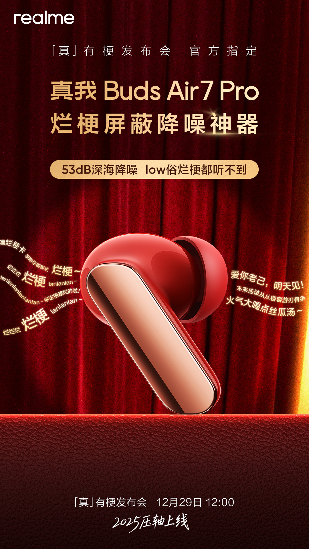 «Шокирующе! Уровень юмора на презентации продукта "Really Funny" превзойдёт все ожидания?! Целых 17 аплодисментов – уровень смеха просто зашкаливает! На этот раз Realme наконец-то представит свои 17 и Pro Max!». На одном из постеров изображены наушники Realme Buds Air 7 Pro, которые могут получить новогоднее специздание или что-то в этом духе.