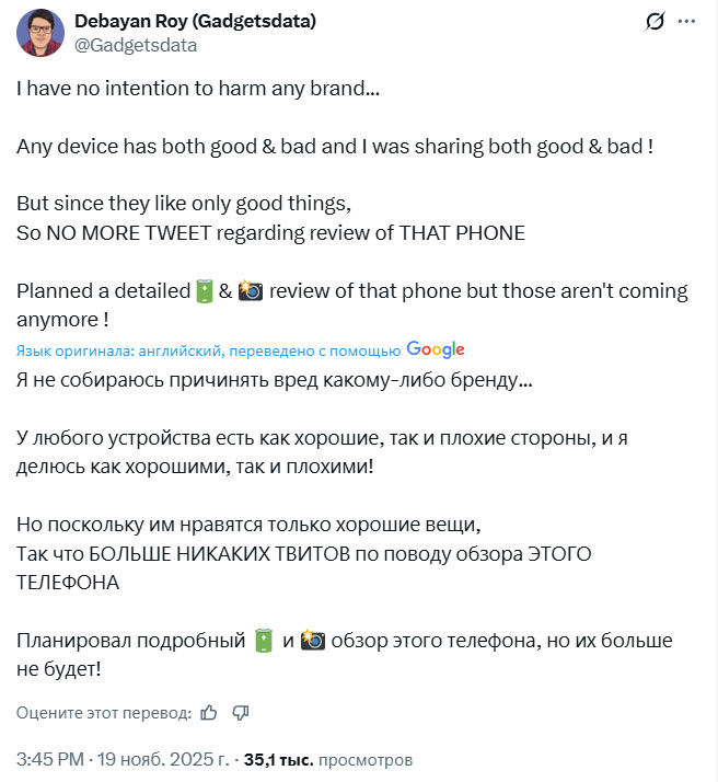 Причиной стала довольно безобидная публикация в X (бывший Twitter) о том, что свежий OnePlus 15 имеет проблему с перегревом при записи видео в формате 4K@60fps. В небольшой заметке блогер честно сообщил, что девайс прогревается до 50 градусов Цельсия, после чего автоматически прерывает видеозапись и не даёт её возобновить на протяжении 5 минут. Вскоре публикация неожиданно исчезла, а вместо неё блогер опубликовал другую со следующим содержанием: