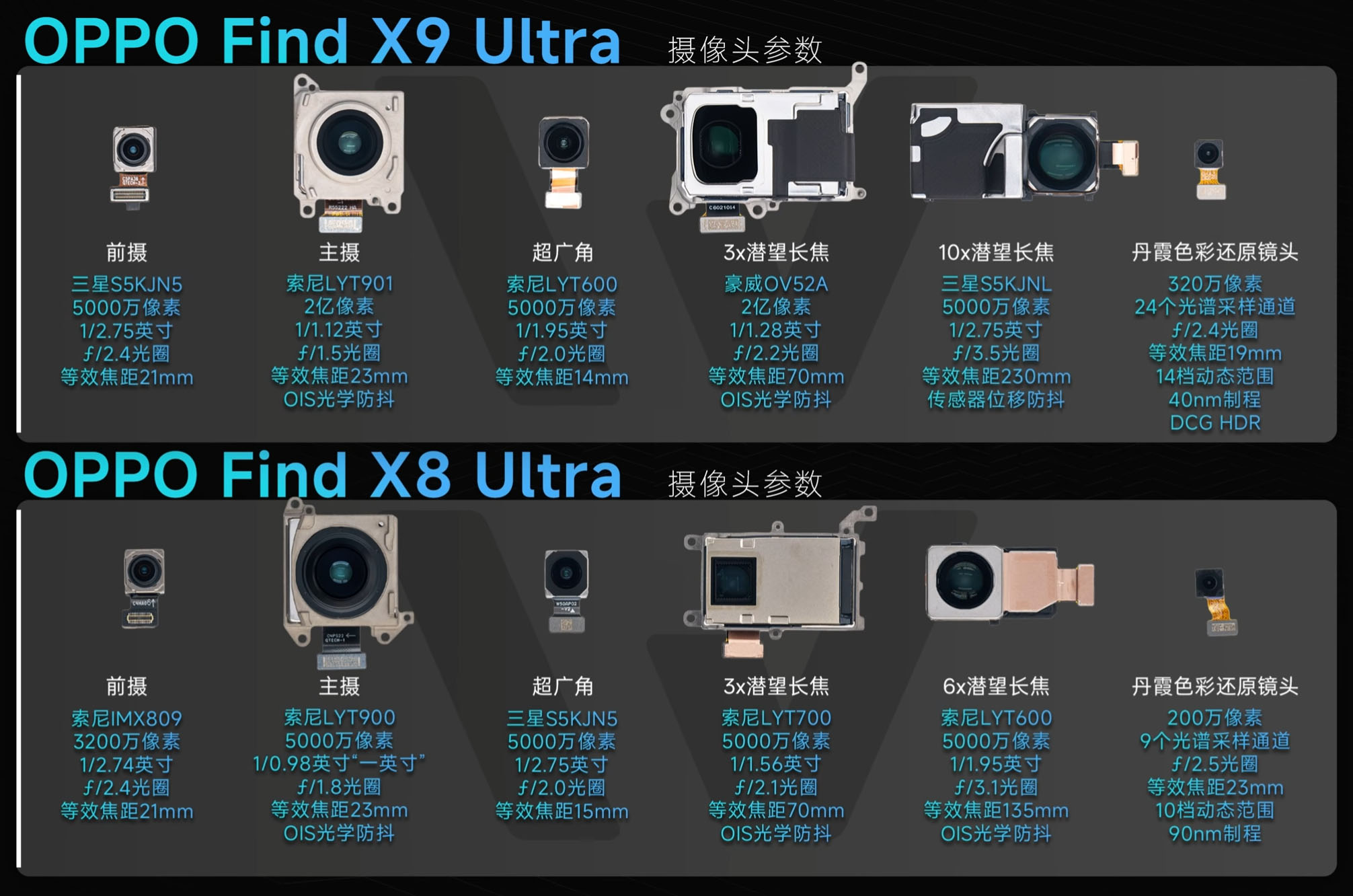 Изучению камер девайса был посвящён предыдущий материал автора, а потому здесь мы ограничимся сводкой характеристик всех модулей камер Find X9 Ultra на изображении, для наглядности прогресса сопоставляемые с набором Find X8 Ultra: