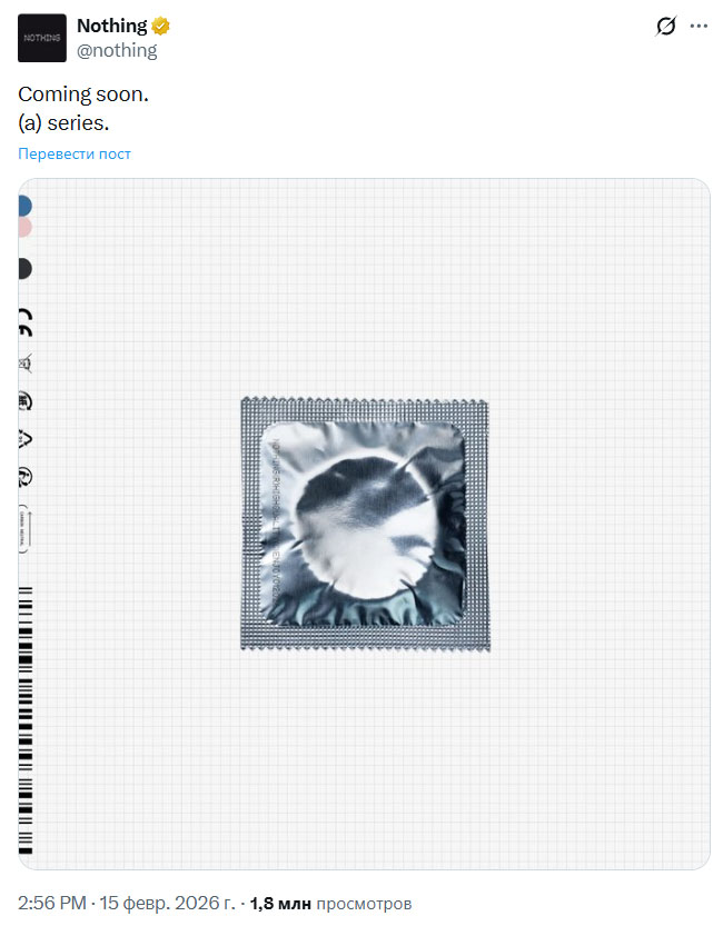 Предположение о том, что это юмор касательно Дня святого Валентина не особо стыкуется с датой публикацией поста – 15 февраля. На этикетку добавлена надпись «NOTHING (R) HIGH QUALITY (C) ENJOY 012026», указывающая на истёкший срок годности резинового изделия №2. Не исключено, что Nothing планирует применить этот вброс будет как-то применён для уклонения от числа «4» в названии серии, чтобы вместо Phone (4a) выпустить Phone (5a). Подробнее узнаем ближе к марту, когда в Китае завершается новогодние празднования.