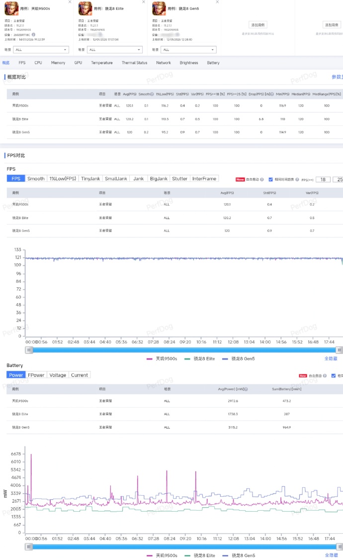 Напоследок – Honor of Kings на высоких настройках в 120 fps. 120,1 у 9500s, 120,2 у 8 Elite и ровно 120 у 8 Gen 5. По потреблению же разброс имеется, хоть небольшой: 1,7 Вт у 8 Elite, 3 Вт у 9500s и 3,1 Вт у 8 Gen 5. У 9500s наблюдаются странные пики очень высокого потребления, что могло отрицательно сказаться на результате, но они редкие и не должны сильно портить конечное число.