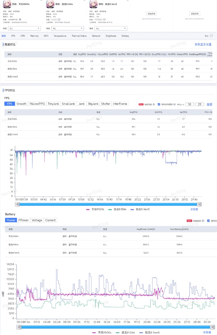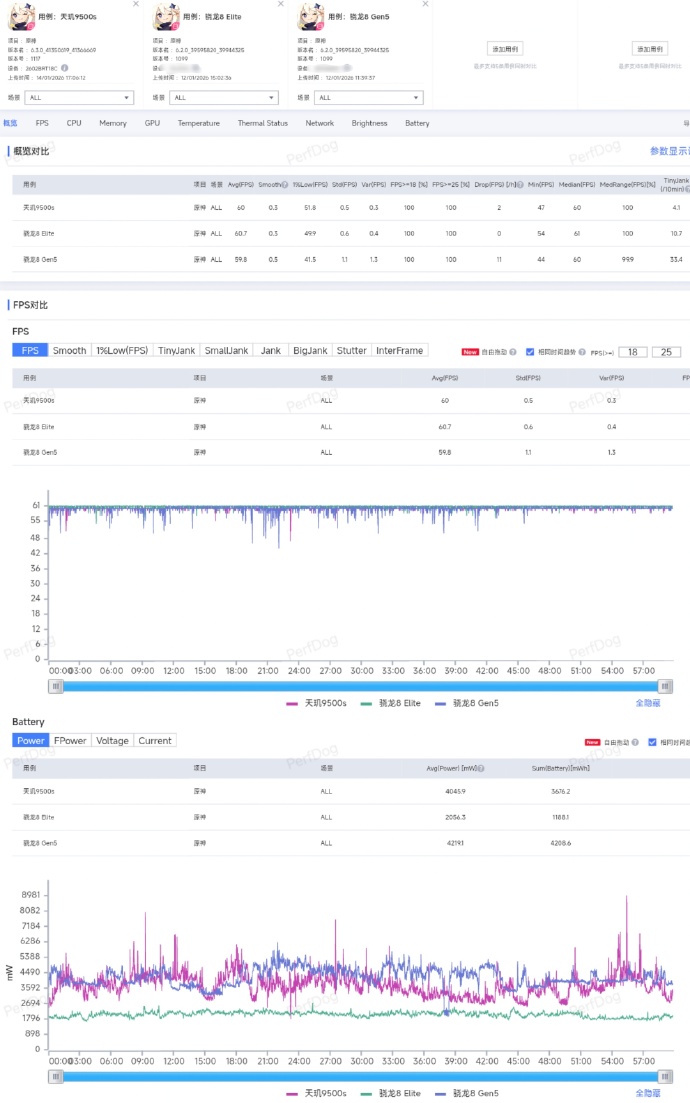 Далее идет прогон в Honkai: Star Rail в режиме 60 fps с максимальной графикой. Среднее значение fps примерно одинаковое: 59,6 у 9500s, 59,7 у 8 Elite и 56,4 у 8 Gen 5. Однако, в какой-то момент 8 Elite “поплохело” до 45 fps, и в течение минуты он не мог вернуться в планку 60 кадров. В потреблении же чипы очень сильно разошлись: если 8 Elite потребовалось в среднем 3,5 Вт, то 9500s добирает 6 Вт, а 8 Gen 5 – 7,2 Вт.