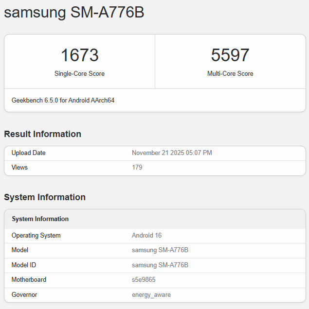 В базе данных бенчмарка Geekbench появились результаты тестирования Samsung SM-A776B, то есть Galaxy A77, что означает возрождение A70. Судя по опубликованным данным, смартфон получит 8 ГБ оперативной и памяти и неанонсированный чипсет Samsung с индексом S5E9865. За графику в этом чипсете будет отвечать фирменнаый GPU Xclipse 940 — такой же, как в Exynos 2400 и 2400e, установленных в Galaxy S24/S24+, S24/S25 FE и Z Flip 7 FE.