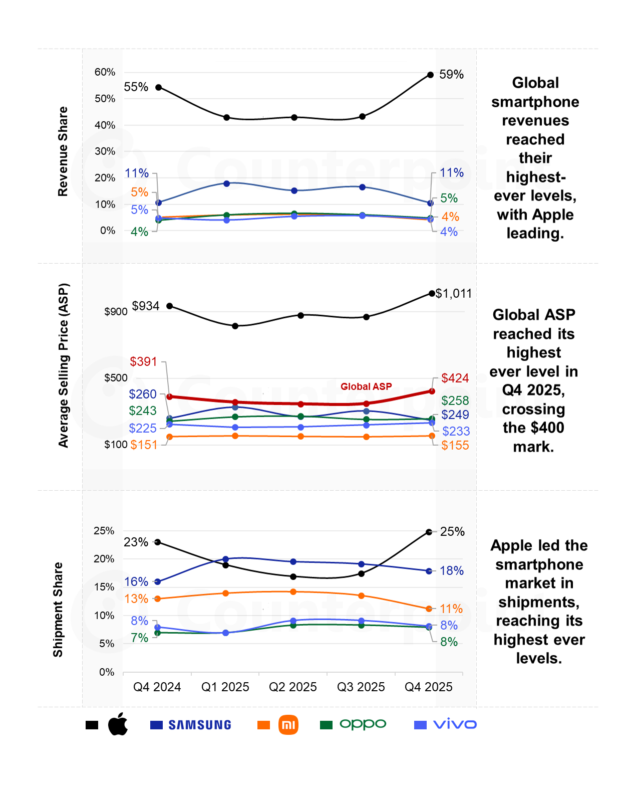 У этого взлёта есть несколько причин и основная среди них – ежегодный всплеск продаж iPhone, которые стоят значительно дороже большинства Android-смартфонов и потому вносят большое влияние на среднерыночный чек при покупке. К примеру, с октября по декабрь 2025 года фанаты Apple отдавали за один экземпляр iPhone в среднем $1011 (против $934 год назад), что лишь подтверждает рост популярности старших iPhone 17 Pro.
