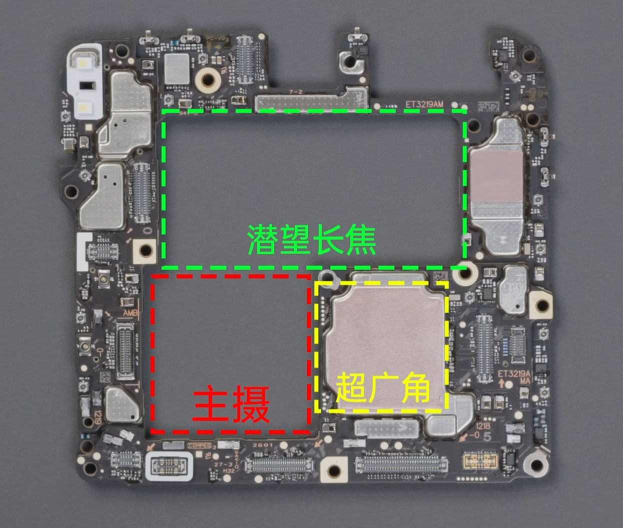 Оптика всех трёх камер имеет покрытие Zeiss T*, а Г-образный перископ стал немного крупнее в размерах из-за более продвинутой системы оптической стабилизации. Из-за нехватки места модуль ширика пришлось расположить прямо над чипсетом Snapdragon 8 Elite Gen 5, из-за чего он будет подвергаться дополнительному нагреву. К слову об этом: Vivo нарастила площадь теплоотводящих пластин, благодаря чему стабильность чипа под нагрузкой должна улучшиться.