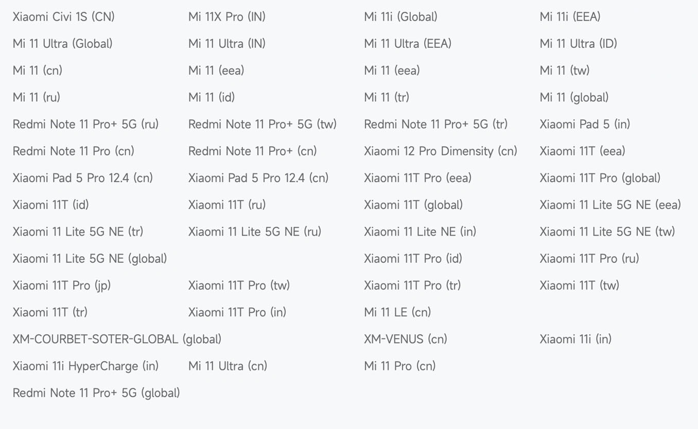 В новый перечь вошло несколько десятков устройств, большинство из которых являются ребрендингами одних и тех же смартфонов для разных рынков сбыта. В основном Xiaomi распрощалась с продуктами 2021-2022 годов, включая линейку Xiaomi 11, Xiaomi 11T, Redmi Note 11, Xiaomi 12 Pro Dimensity, а также планшеты Xiaomi Pad 5.